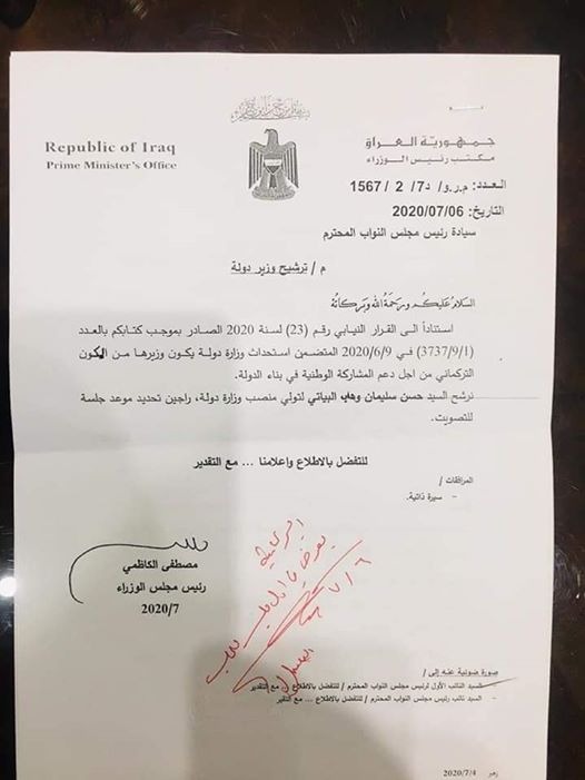 وكان البرلمان العراقي قد منح الكاظمي، في يونيو/ حزيران الماضي، صلاحية استحداث وزارة دولة لإسناد المنصب إلى المكون التركماني استجابة لمطلبهم.