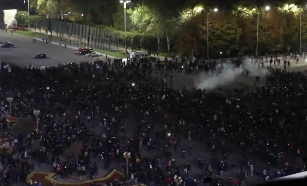 وفرقت الشرطة المظاهرة في وقت متأخر من مساء يوم الاثنين لكن المتظاهرين عادوا إلى الساحة المركزية بالعاصمة بشكك بعد ساعات واقتحموا المبنى الذي يوجد به مقر الرئاسة والبرلمان. واشتعلت النيران في المبنى المعروف محليا باسم البيت الأبيض صباح الثلاثاء.