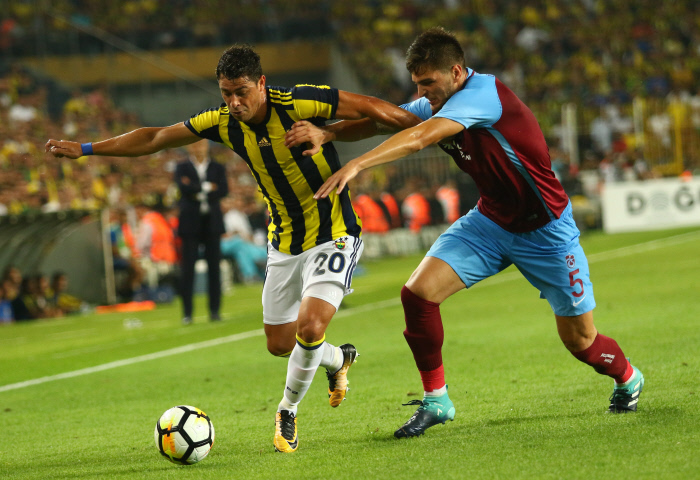 Guiliano (L) of Fenerbahce and Okay Yokuslu of Trabzonspor during the Turkey Superlig match between Fenerbahce and Trabzonspor at Sukru Saracoglu Stadium in Istanbul , Turkey on August 20 , 2017.Final Scores : Fenerbahce 2 - Trabzonspor 2