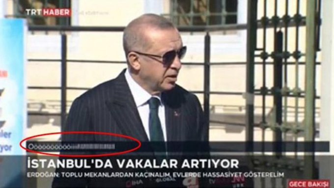 أردوغان عقب صلاة الجمعة الماضي، ظهر في بث تليفزيوني مباشر وأدلى بتصريحات تحدث فيها عن أزمة وباء كورونا المستجد (كوفيد-19)، إلا أنه خلال حديثه ظهرت أحرف: ” Öööööööiiiiiillllll” على الشاشة بشكل مفاجئ، والمعني الأقرب للأحرف هو: “مُتْ” “ölüm”.