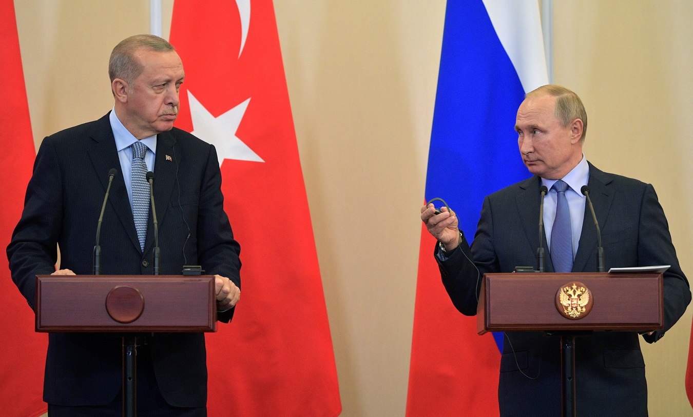 Russian President Vladimir Putin and Turkish President Tayyip Erdogan attend a news conference following their talks in Sochi, Russia October 22, 2019. Sputnik/Alexei Druzhinin/Kremlin via REUTERS ATTENTION EDITORS - THIS IMAGE WAS PROVIDED BY A THIRD PARTY. - RC1A0078E300