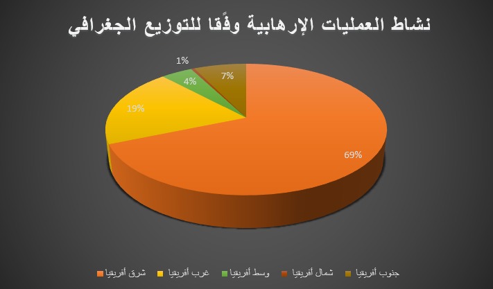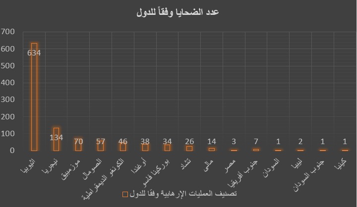 وأورد التقرير أن أكثر الأقاليم تضررًا هو إقليم شرق أفريقيا بواقع 691 ضحية، أي حوالي 65% من النسبة الكلية لضحايا الشهر فى القارة، وذلك نتيجة ما لا يقل عن 16 حادثة معلن عنها في 5 دول. فيما جاءت إثيوبيا في طليعة الدول الأكثر دموية للشهر الثانى على التوالى، وسقط فيها ما يزيد عن 634 شخصًا.