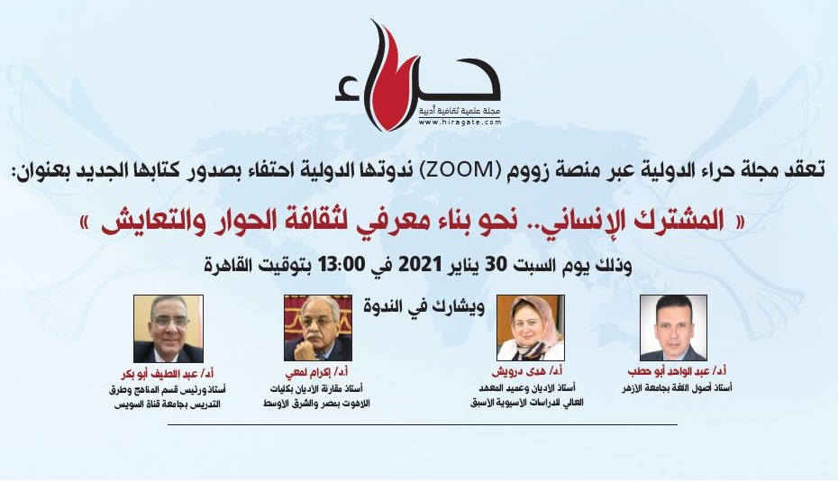 القاهرة (زمان التركية) – تعقد مجلة حراء الثقافية ندوة دولية احتفاءًا بصدور كتابها الجديد بعنوان: “المشترك الإنساني نحو بناء معرفي لثقافة الحوار والتعايش”.