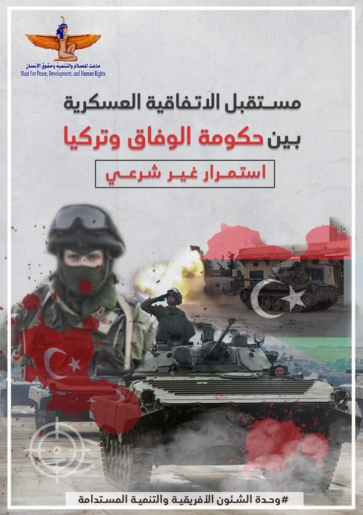 ودعت مؤسسة ماعت للسلام والتنمية وحقوق الإنسان في تقرير حديث البرلمان الليبي والحكومة الجديدة إلى وقف العمل بالاتفاقية العسكرية، والتي عقدتها حكومة الوفاق مع الحكومة التركية في 2019.