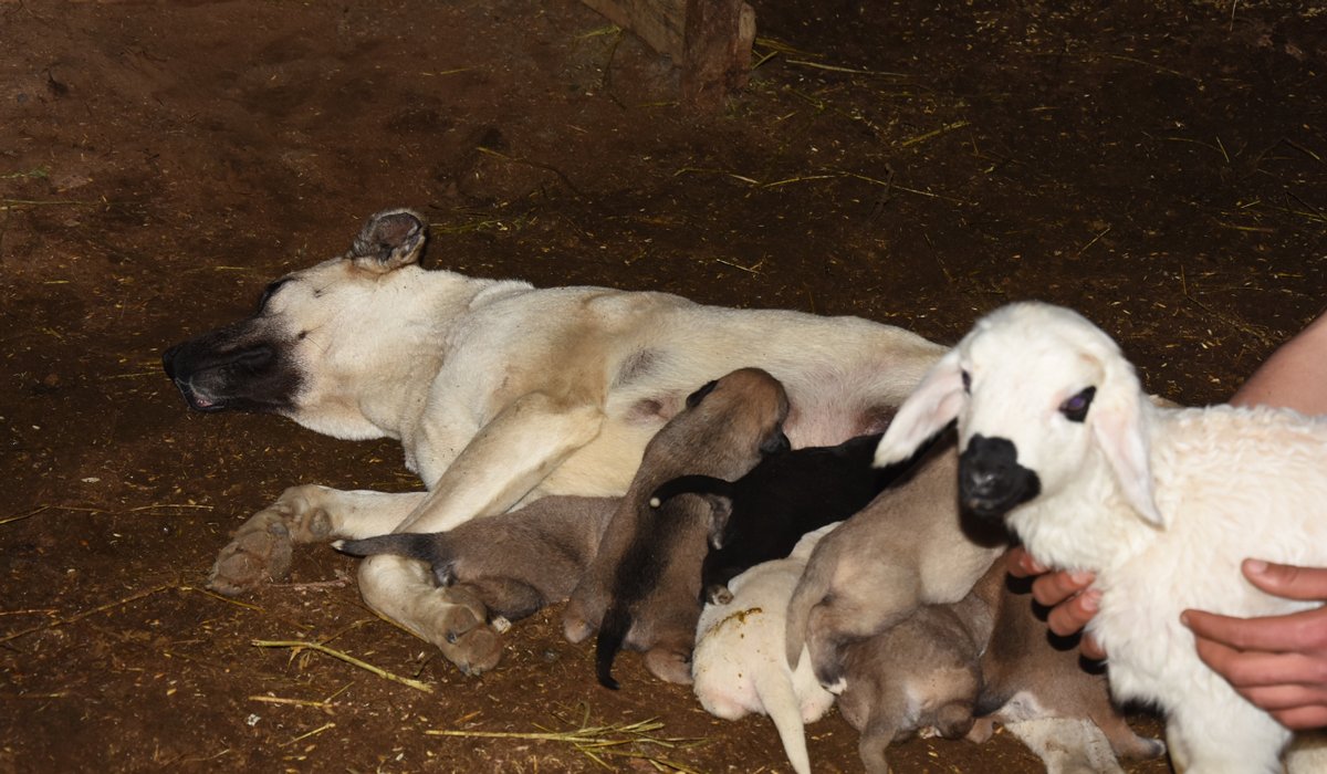 وبجانب الجراء السبعة اللذين وضعتهم حديثا، ترضع كلبة الرعي صغير الخروف.