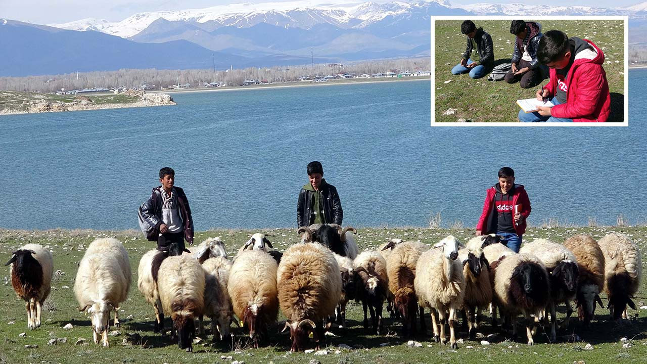 ويستغل أران ومرت وأمين، الذين يقطنون في حي شلبي باغ الواقع على بعد 10 كيلومترات من مركز البلدة، إغلاق المدارس وإتاحة التعليم عن بعد بسبب جائحة كورونا في مساعدة أسرهم وذلك من خلال رعي الأغنام التي تربيها عائلاتهم.