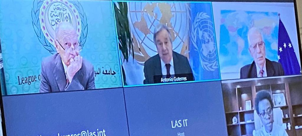 ووفق بيان صدر عن الجامعة العربية عقد الاجتماع السادس من نوعه للجنة الرباعية، الثلاثاء على مستوى قيادات المنظمات الأربع وشهد مشاركة كل من أنطونيو جوتيريس سكرتير عام الأمم المتحدة، وجوزيب بوريل الممثل الأعلى للاتحاد الأوروبي للشئون الخارجية والسياسة الأمنية، ومونيك نسانزباجاجانوا نائبة رئيس مفوضية الاتحاد الأفريقي التي مثلته رئيس المفوضية موسى فقيه محمد.