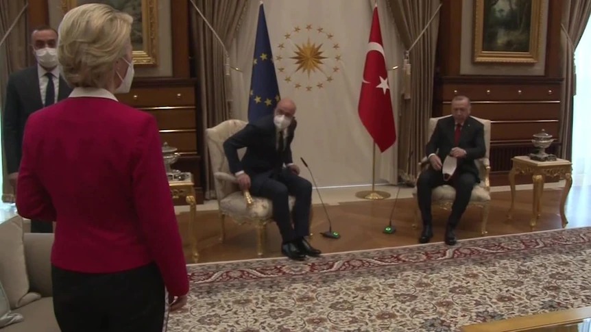 رئيسة المفوضية الأوروبية، أورسولا فون دير لاين، أجرت تقييما لزيارتها أنقرة في 6 أبريل الجاري حيث رافقت رئيس مجلس الاتحاد الأوروبي تشارلز ميشيل، الذي جلس جنبًا إلى جنب مع الرئيس التركي، بينما لم تجد رئيسة المفوضية الأوروبية مقعدًا لها بجوار أردوغان واضطرت للجلوس في مواجهة وزير الخارجية التركي مولود جاويش أوغلو.