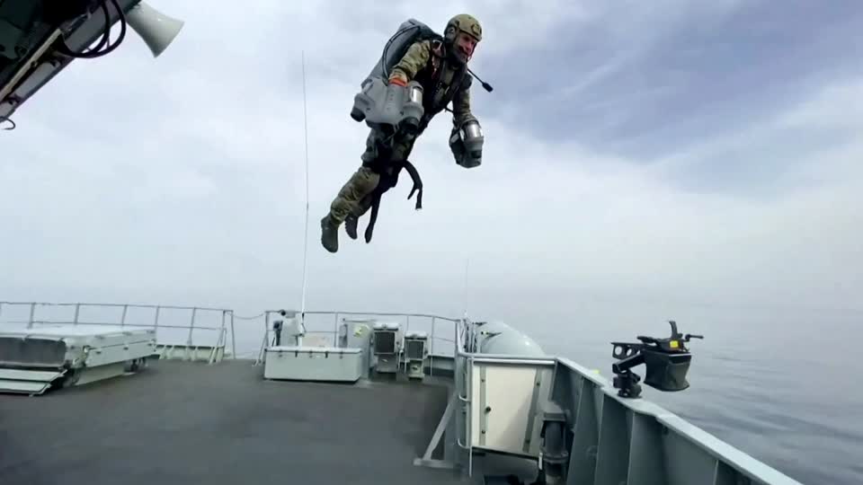 البحرية نشرت لقطات تظهر أحد الأفراد وهو يرتدي البدلة النفاثة ويطير فوق القوارب ثم يهبط على السفينة قبل الآخرين.
