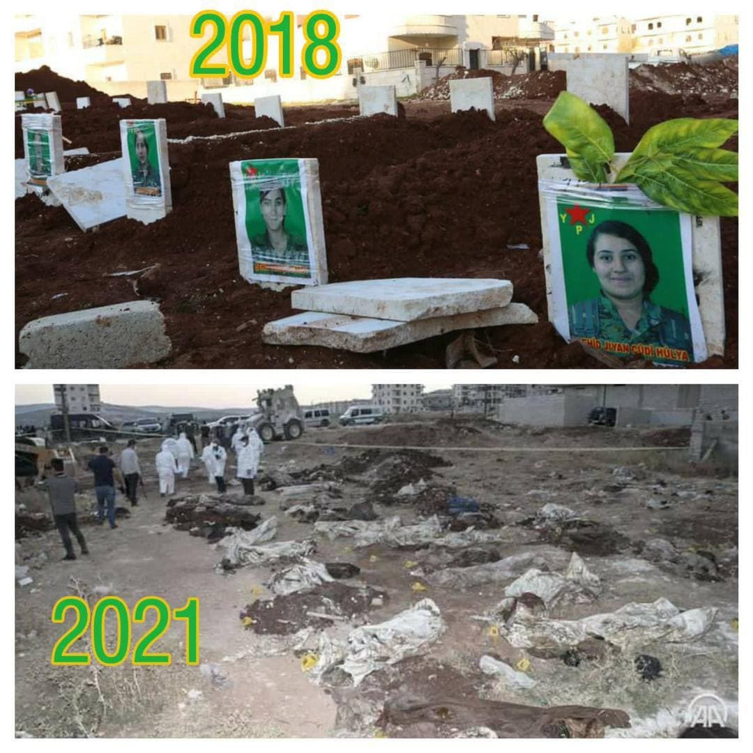 وأظهرت صور نشرتها السلطات الكردية مقبرة لقتلى قواتها في عفرين عام 2018 في موقع يشبه الموقع الذي تحدثت عنه وزارة الدفاع التركية، التي قالت الأربعاء إنها عثرت على جثث 35 شخصا في مقبرة جماعية بمحيط عفرين، متهمة “وحدات حماية الشعب” الكردية بقتلهم.