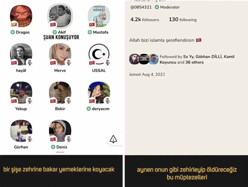 خلال غرفة دردشة على تطبيق “كلوب هاوس” Clubhouse، الشهير، قال أحد أنصار الحزب الذي يتزعمه الرئيس التركي، رجب طيب أردوغان، ويدعى مصطفى آيدن: “دعونا لا نطعمهم في السجن. دعونا لا نقدم لهم الطعام. يأكلون بعضهم البعض. علينا أن نقتلهم. كما اعتدنا على تسميم الكلاب في الماضي، نحن بحاجة للقيام بذلك”.