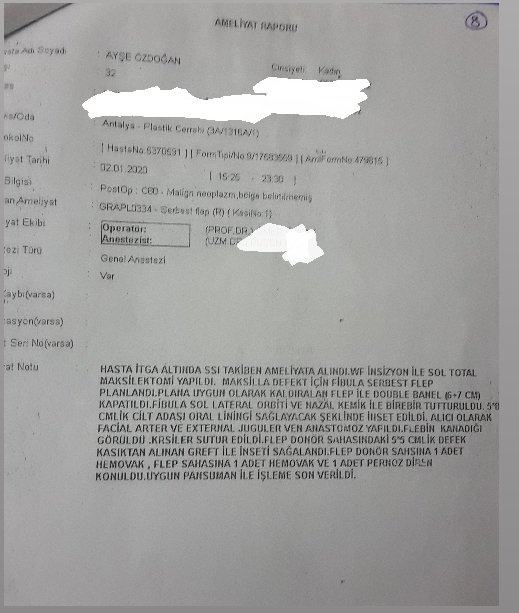 بسبب تأخر علاجها أثناء إقامتها في السجن، أزيلت أسنانها العلوية اليسرى والفك الأيسر وعظام الوجنة والعقد الليمفاوية. كان التجويف الذي تشكل تحت فكها الأيسر مليئًا بالعظم المأخوذة من ساقها. تعاني فقدان في السمع والبصر والكلام. تلقت العلاج الإشعاعي بعد عملية جراحية كبرى. بسبب الفتحة في فكها العلوي الأيسر، تتناول الطعام من أنفها.