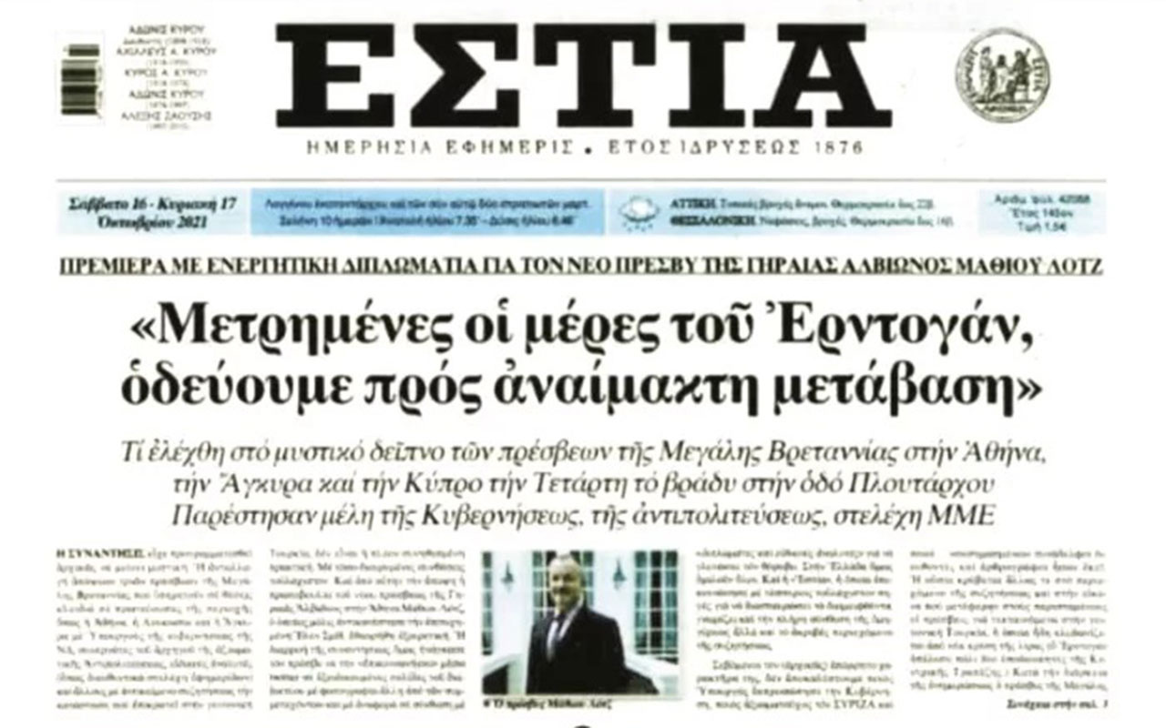 صحيفة “إستيا Estia” ذات الميول اليمينية المحافظة، أقدم الصحف في اليونان والبالغ عمرها 127 عاما، أوضحت أن السفراء البريطانيين في أثينا ونيقوسيا وأنقرة، اجتمعوا في العاصمة اليونانية مع ممثلين سياسيين وإعلاميين يونانيين ووزراء الحكومة اليونانية وممثلي حزب المعارضة الرئيسي في اليونان سيريزا ومحرري الصحف وكتاب الأعمدة.