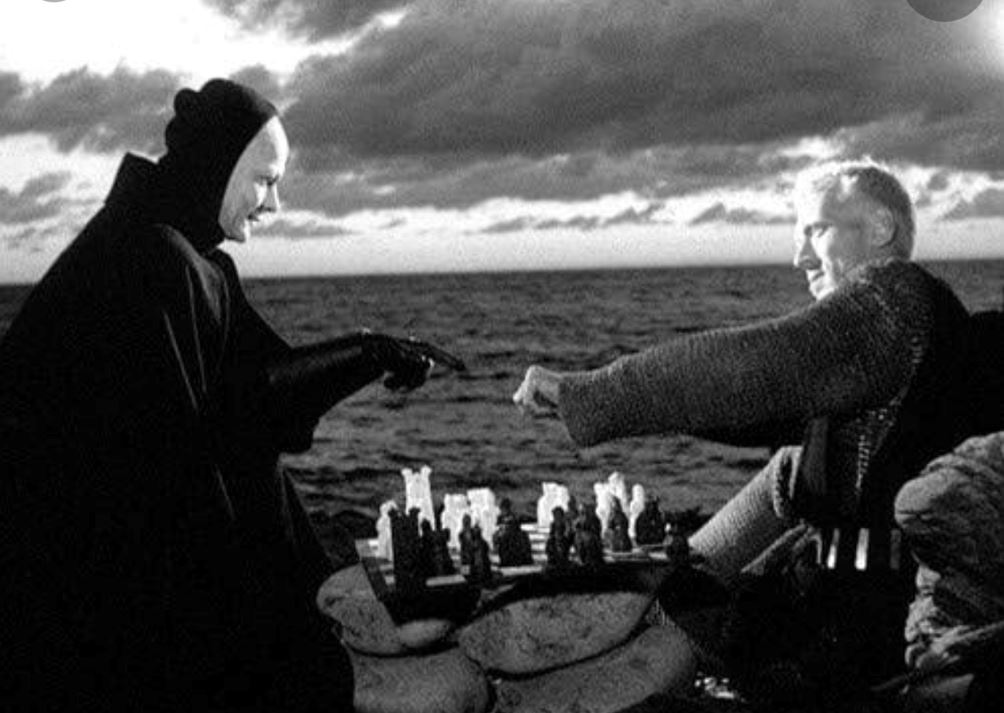 وبينما يستفيق “أنطونيوس” من غفوته الطويلة وهو على مشارف بلدته علي شاطئ بحر، ويهم برص قطع الشطرنج حتى يفاجأ برجل غريب الأطوار يتجلى أمامه وجها لوجه، يرتدي عباءة سوداء تغطيه من رأسه حتى قدميه ولا يخرج منها سوى وجهه بملامح باردة ويكاد يكون وجهه متجمدا، فيسأله “من أنت؟” فيرد: “أنا ملك الموت كنت بجوارك منذ فترة طويلة”..ثم يبلغه بأن يرحل معه حيث أزف وقت مغادرته الحياة.