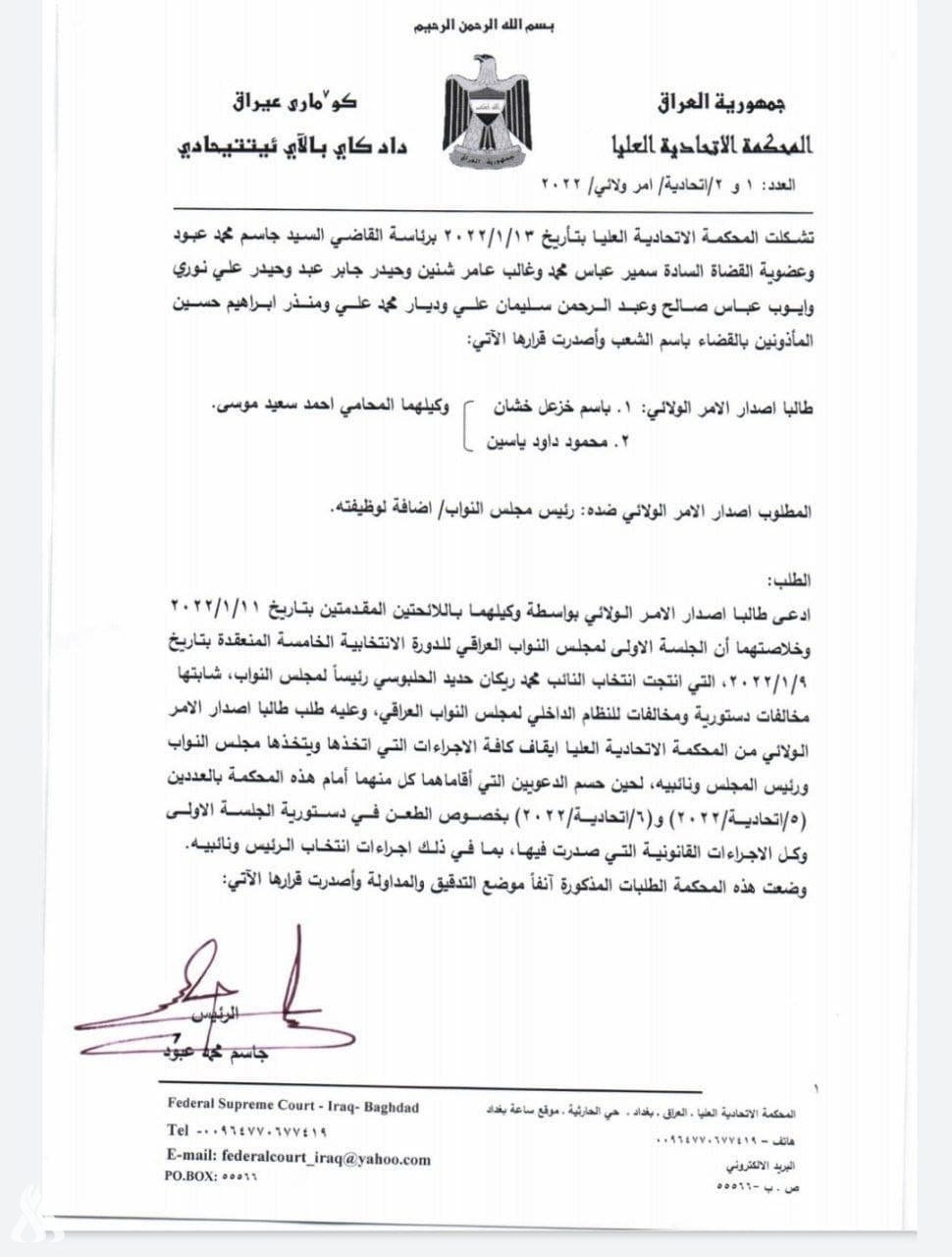 قرار المحكمة الاتحادية بشأن نص على “إيقاف كافة الإجراءات التي اتخذها ويتخذها مجلس النواب ورئيس المجلس ونائبيه” وذلك لحين حسم دعويين أقامهما النائبين باسم خزعل خشان، ومحمود داود ياسين.