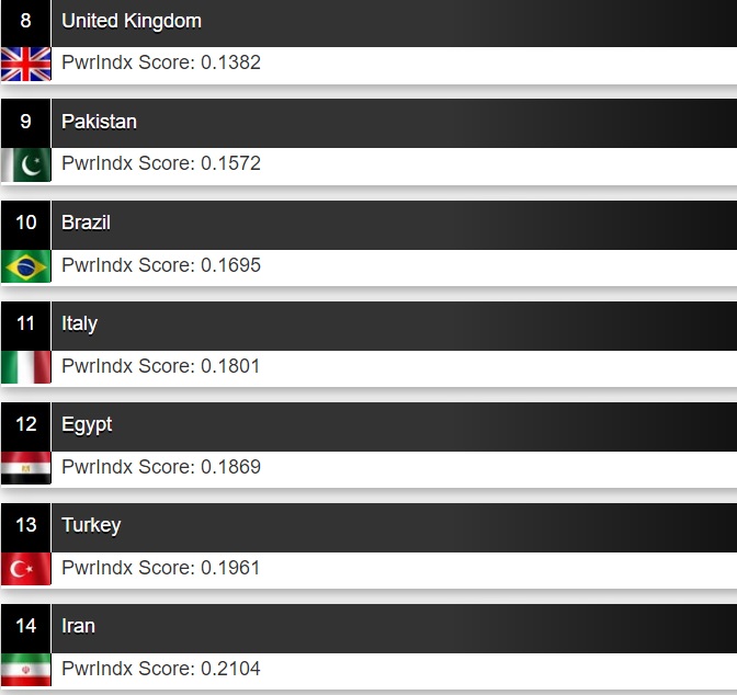 حل الجيش المصري بالمرتبة 12 من إجمالي 140 دولة، متقدما على تركيا التي حلت بالمرتبة 13، والجيش الإيراني الذي حل بالمرتبة 14.