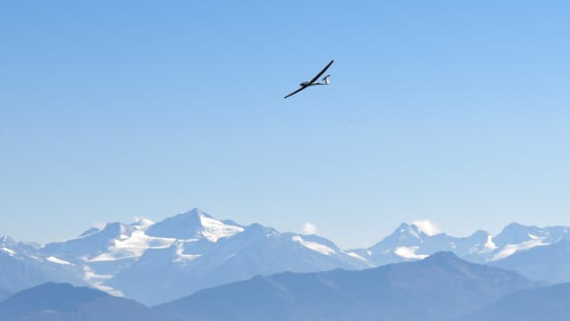 A glider is seen above an alpine panorama near Spitzingsee, Bavaria, southern Germany, on October 13, 2018. (Photo by Tobias Hase / dpa / AFP) / Germany OUT