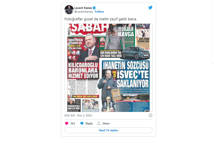من جانبه نشر كنز تغريدة عبر تويتر انتقد خلالها بشكل ساخر إقدام الصحيفة التركية على نشر معلوماته الشخصية، قائلا: “الصور جيدة، لكن نص الخبر ضعيف”.