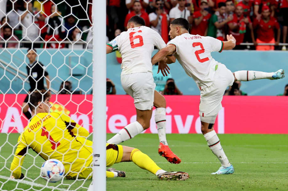 وبدا الأمر كما لو أن المغرب قد نجح في تحقيق الاختراق المبكر في نهاية الشوط الأول، حيث سدد حكيم زياش ركلة حرة صاروخية في مرمى كورتوا، على الرغم من استبعاده لاحقًا من قبل حكم الفيديو المساعد (VAR) بداعي التسلل.