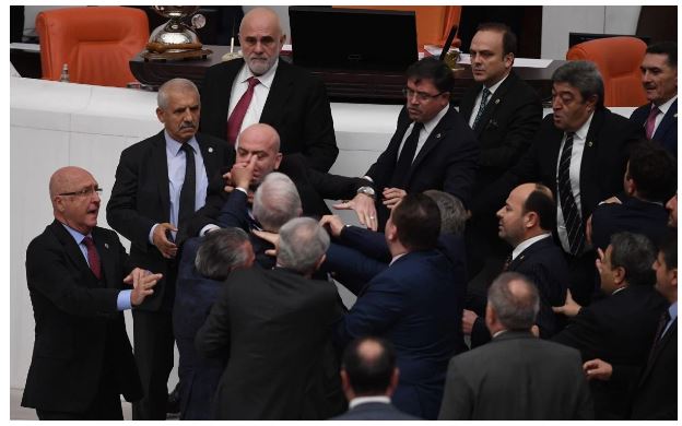 وخلال المناوشات أقدم نائب حزب العدالة والتنمية، ظفر إيشيك، على لكم نائب حزب الخير عن مدينة طرابزون، حسين أورس.