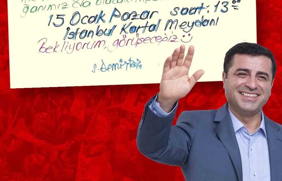 حساب دميرطاش الدي يديره محاميه، قال: “نحتاج إلى إظهار قوتنا في مسيرة تحالف العمل والحرية في إسطنبول-كارتال في الساعة 1:00 ظهرًا يوم الأحد. قد يكون الطقس باردًا ولكن التطورات دافئة. من فضلكم استعدوا جميعا لتكونوا في المسيرة. أنا قادم أيضًا. إذا كنت لا تصدق ذلك، تعال وشاهد”.
