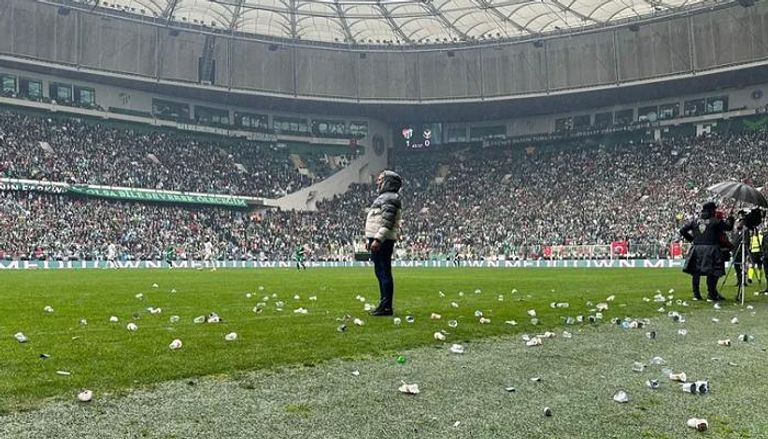 تم إلقاء عدد كبير من زجاجات المياه والمفرقعات من المدرجات على أرض الملعب.