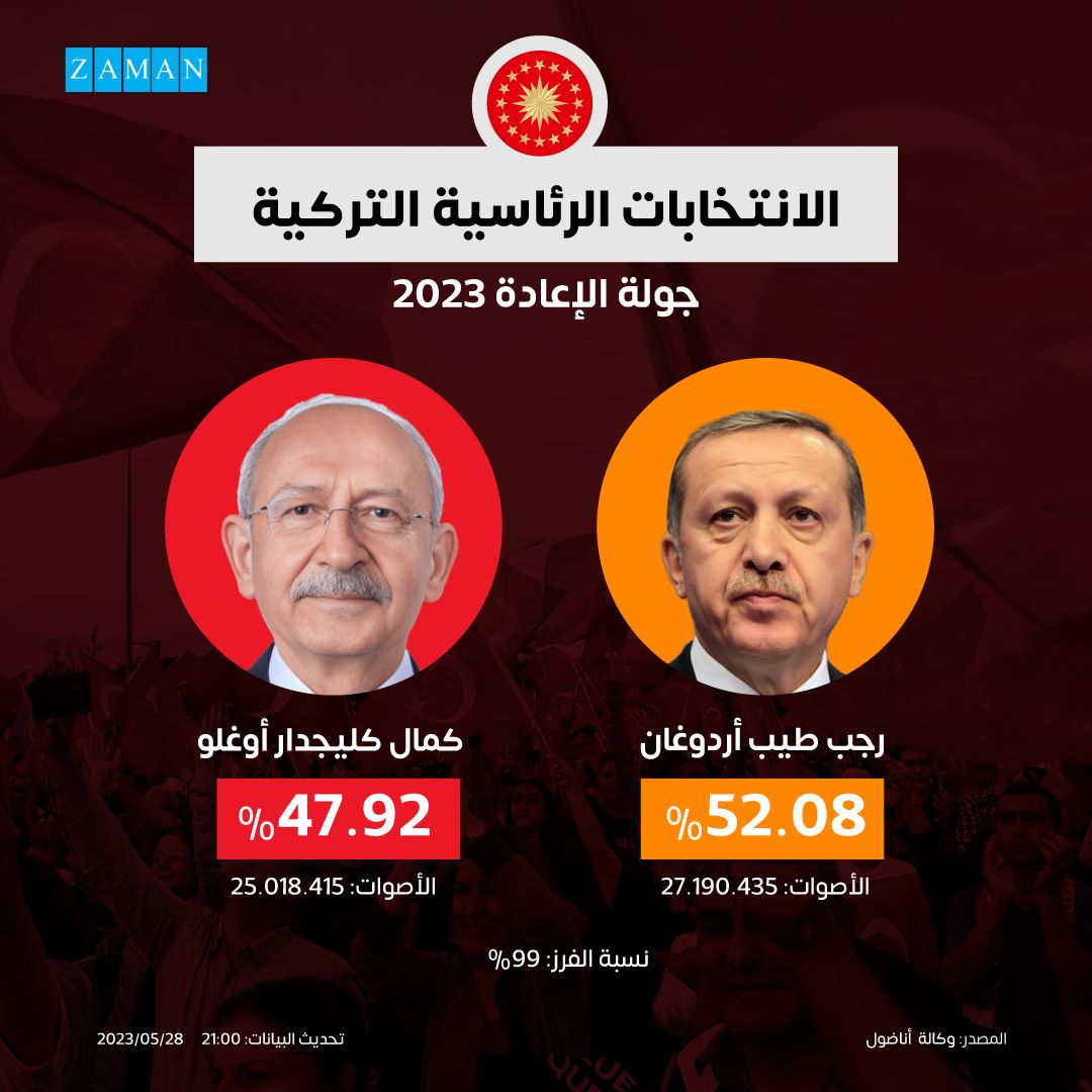 وتظهر نتائج رصد وكالة الأناضول الحكومية بعد فرز 97 بالمئة من الأصوات، أن أردوغان حصل على 52.08%، بينما كيليتشدار أوغلو حصل على 47.92%.