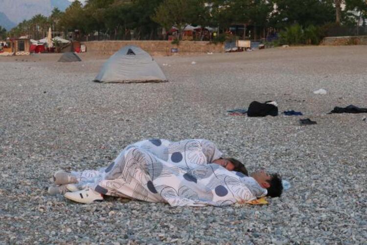 أنطاليا (زمان التركية) – ارتفعت درجات الحرارة فوق معدلات الموسم في مدينة أنطاليا التركية، مما دفع المواطنين لقضاء ليلتهم على شاطئ كونيالتي المشهور. بعض الناس اختاروا قضاء الليل في الخيام المصطفة على الشاطئ، في حين اختار البعض الآخر الاستلقاء على البطانيات المنسدلة على الصخور للنوم.