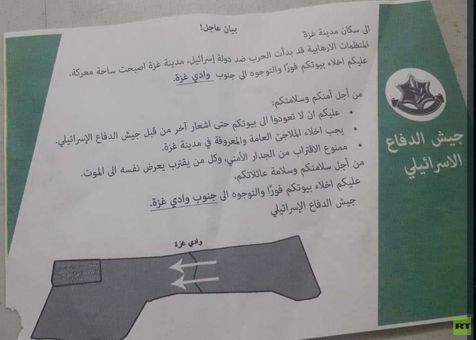 وجاء في المنشورات: “بيان عاجل إلى سكان مدينة غزة.. المنظمات الإرهابية قد بدأت الحرب ضد دولة إسرائيل، مدينة غزة أصبحت ساحة معركة. عليكم إخلاء بيوتكم فورا والتوجه إلى جنوب وادي غزة.