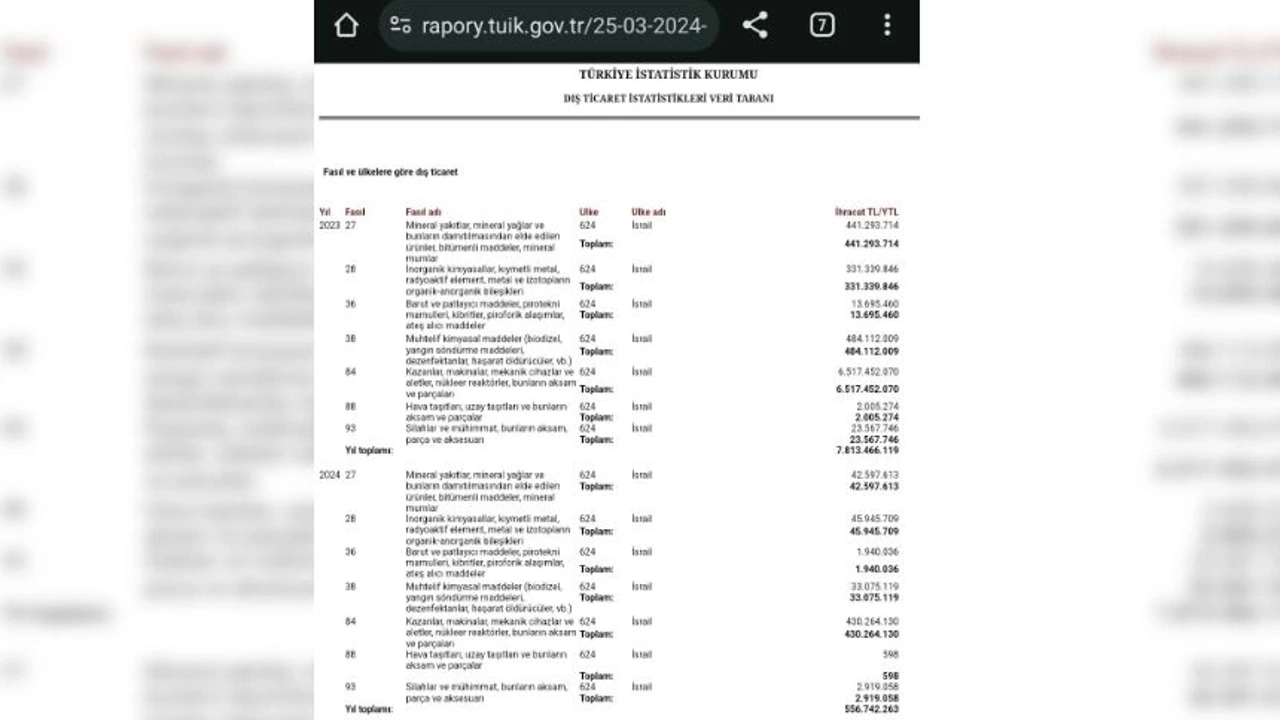 ووفقًا للبيانات الرسمية التي نشرها معهد الإحصاء التركي يوم الاثنين، بحسب قاعدة بيانات إحصاءات التجارة الخارجية، ونقلتها قناة TV5 الإخبارية التركية، فإنه في يناير 2024، صدرت تركيا إلى إسرائيل ذخائر وأسلحة بقيمة 2,919,058 ليرة تركية، وبلغت صادرات البارود والمتفجرات 1,940,036 ليرة تركية، وبلغت الصادرات الكيميائية المختلفة (الديزل الحيوي، مواد إطفاء الحرائق، المطهرات، ومبيدات الحشرات) 33,075,119 ليرة تركية.