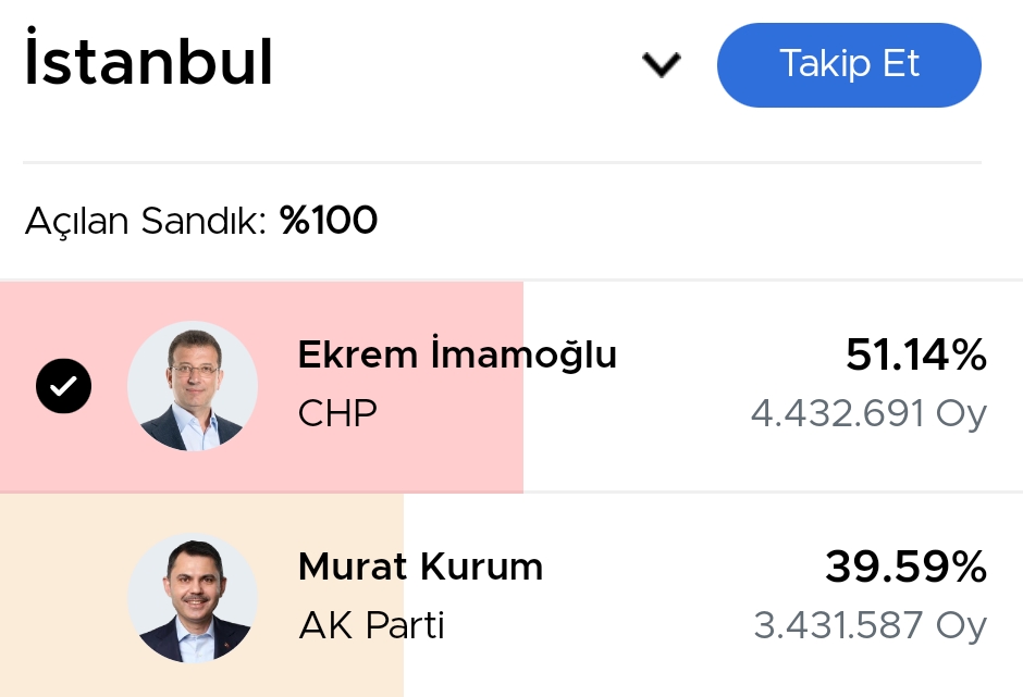 فيما يلي نسب أصوات المرشحين في انتخابات بلدية إسطنبول، بعد فرز 100٪ من الصناديق.