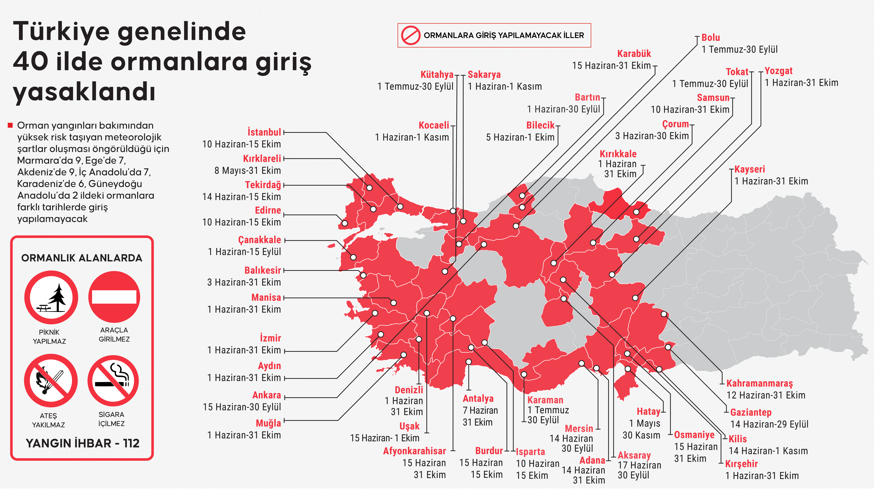 ومنعت السلطات دخول الغابات في 9 محافظات في مرمرة، و7 في بحر إيجة، و9 في البحر الأبيض المتوسط، و7 في وسط الأناضول، و6 في البحر الأسود، و6 في البحر الأسود، و2 في جنوب شرق الأناضول، حيث من المتوقع أن تحدث ظروف جوية ذات مخاطر عالية تسبب حرائق الغابات.
