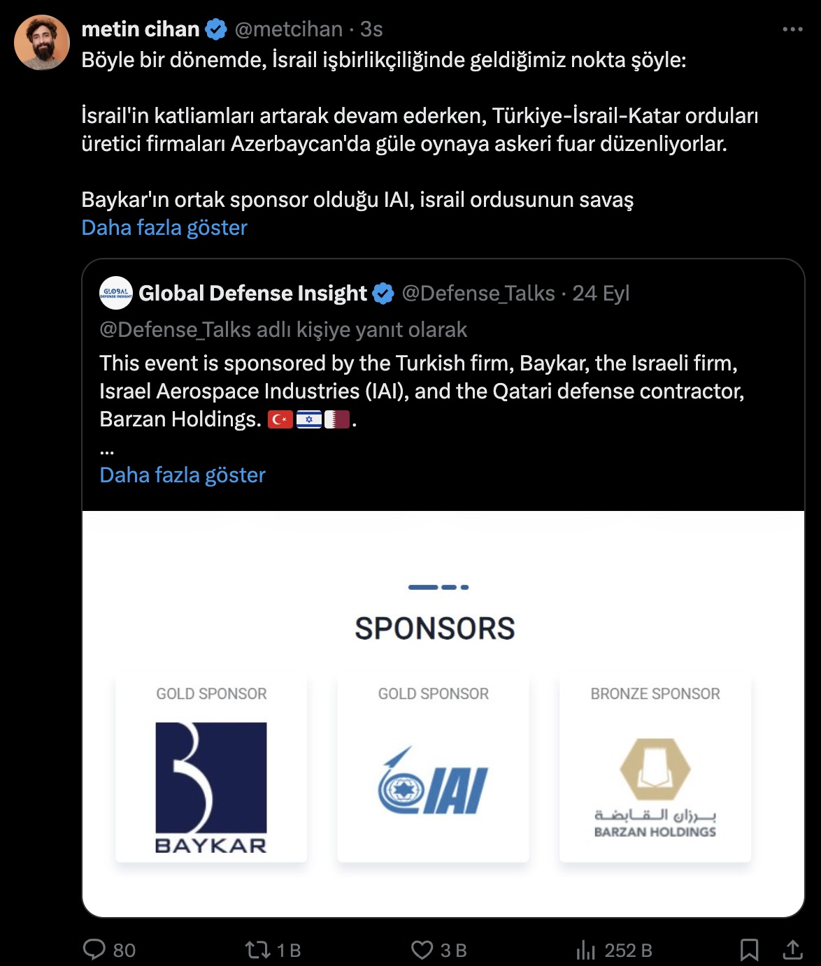 وجاء في منشور متين جيهان على منصة X: “بينما تستمر المجازر الإسرائيلية في الازدياد، تقوم شركات التصنيع التابعة للجيوش التركية والإسرائيلية والقطرية بتنظيم معرض عسكري في أذربيجان، شركة الصناعات الجوية الإسرائيلية، التي تشارك شركة بايكار في رعايتها، هي الشركة التي تنتج طائرات وأسلحة الجيش الإسرائيلي، وهي ليست شركة خاصة، إنها شركة حكومية إسرائيلية”.