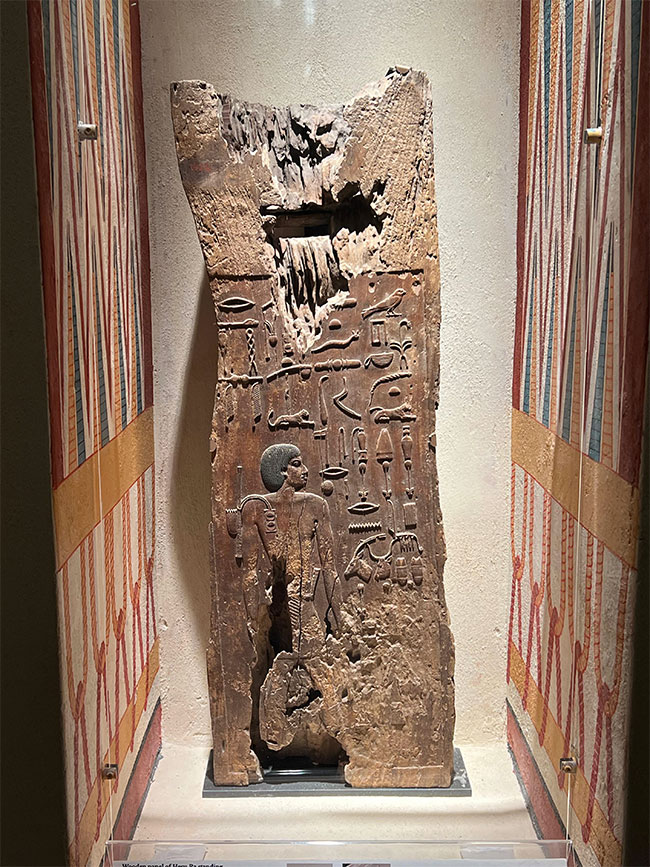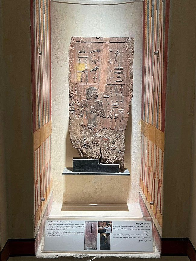 ويعيد المعرض تجسيد المشهد الأصلي للألواح الخشبية داخل المصطبة، بما في ذلك نسخة طبق الأصل بالحجم الكامل للممر الغربي من مقبرة حسائي رع في سقارة. وتُعرض الألواح الخشبية الأصلية في محاريب تحاكي سياقها التاريخي، مع جدار شرقي مزين بنقوش تشبه تلك التي وجدت في المقبرة القديمة.