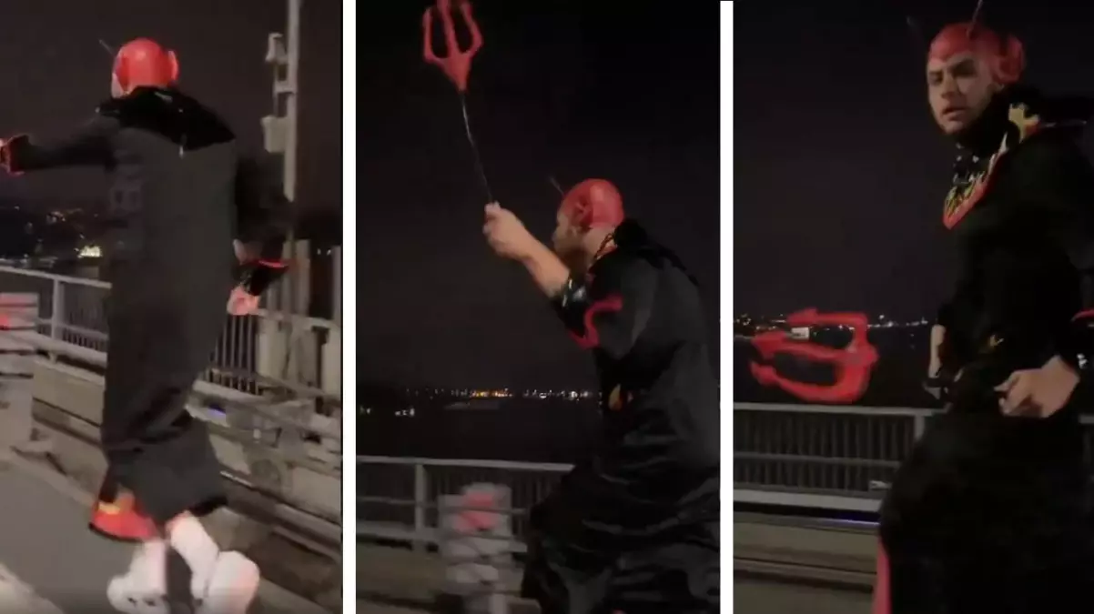 أنقرة (زمان التركية) – أثار شخص يرتدي زي شيطان ويحمل رمحًا في يده الدهشة على جسر البوسفور “جسر شهداء 15 يوليو” في إسطنبول.