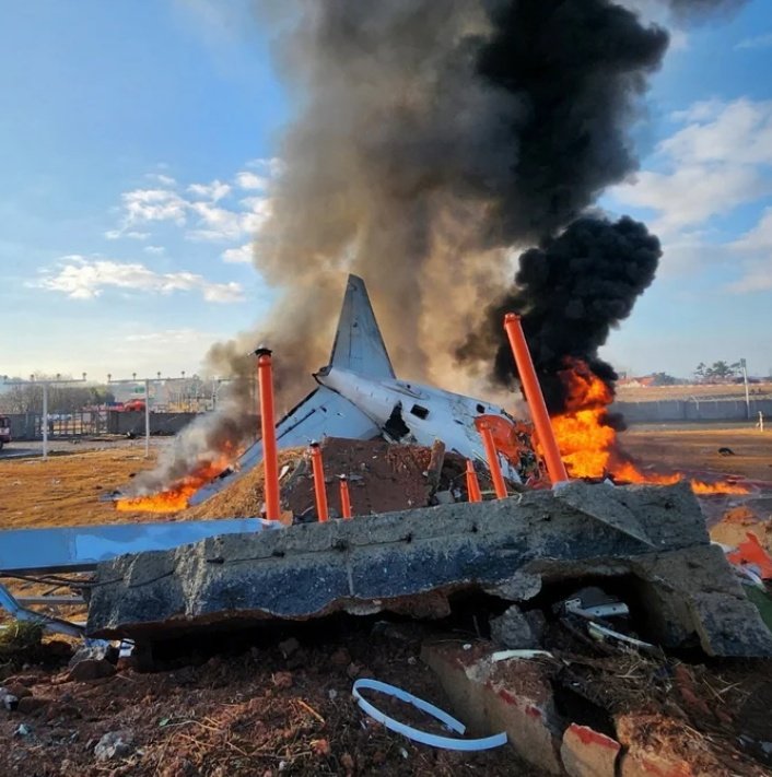 Fire and smoke rise from the tail section of a Jeju Air Boeing 737-800 series aircraft after the plane crashed and burst into flames at Muan IA pic.twitter.com/7nwNe1CYtY