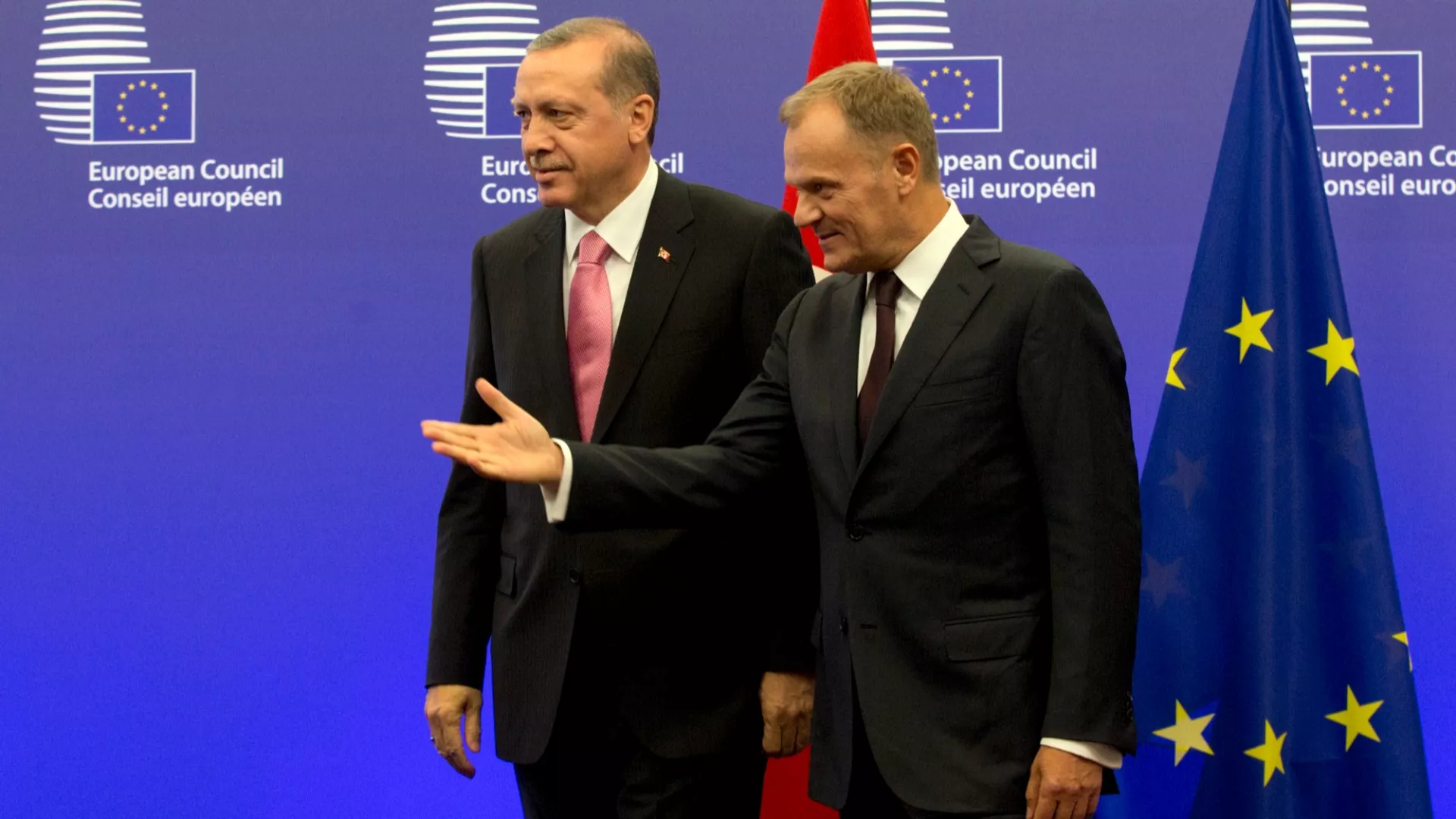تحدّث دونالد توسك، رئيس وزراء بولندا، الرئيس الدوري لمجلس أوروبا، في مؤتمر صحفي مع الرئيس رجب طيب أردوغان في المجمع الرئاسي في العاصمة أنقرة مساء أمس الأربعاء.