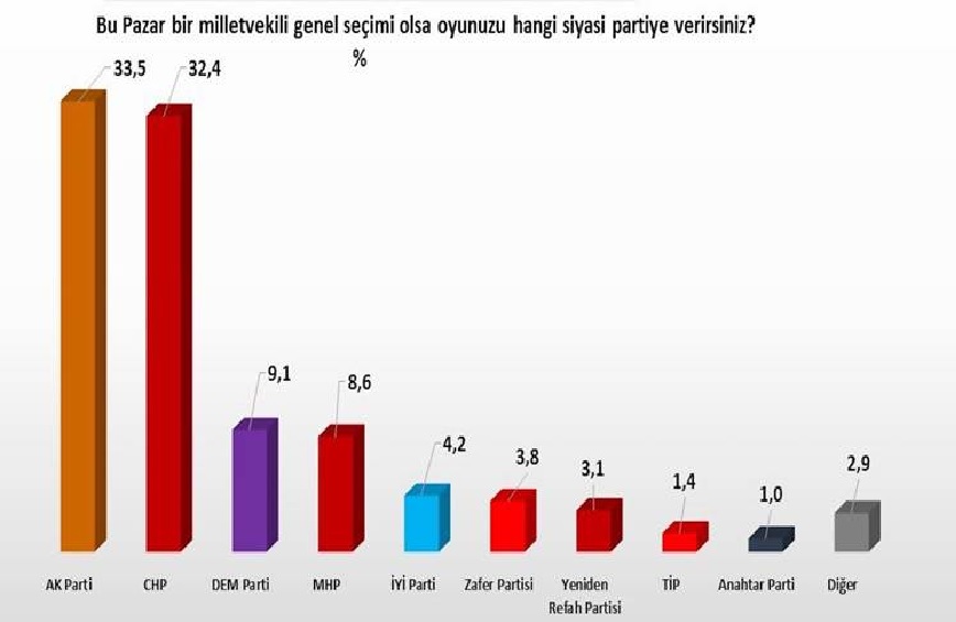 وجاء حزب الشعب الجمهوري في المرتبة الثانية بنحو 32.4 في المئة ثم حزب الديمقراطية والمساواة للشعوب الكردي في المرتبة الثالثة بنحو 9.1 في المئة.
