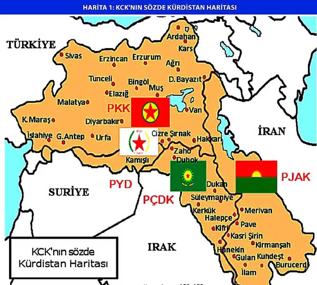 في الخريطة المزعومة لمنظمة اتحاد مجتمعات كردستان، تقع مدن سيفاس، وملاطية، وقهرمان مرعش، وغازي عنتاب، وأورفا، وآغري، وقارص، وإلازيغ، وبينغول، وشرناق تحت سيطرة حزب العمال الكردستاني. ويُلاحظ أن منظمة اتحاد مجتمعات كردستان تنتشر في أربع دول: العراق، وإيران، وتركيا، وسوريا.