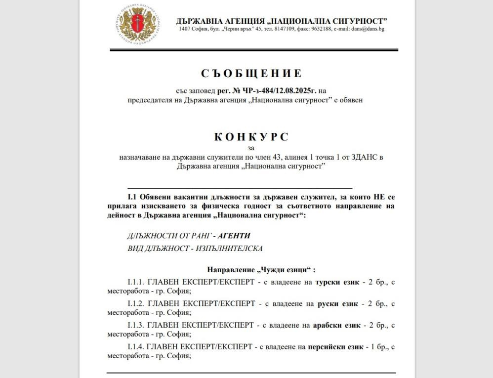 وتم الإعلان عن فرص العمل في وكالة الأمن القومي عبر مواقع التوظيف الشهيرة. ووفقًا للبيان، سيتم توظيف ما مجموعه 6 عملاء في المركز الرئيسي في العاصمة صوفيا، ويجب أن يتقنوا اللغات الروسية، والتركية، والعربية، والفارسية. كما سيتم تعيين موظفين في مدينة يامبول للعمل في مجال الأمن الاقتصادي، دون اشتراط إجادة لغة أجنبية.
