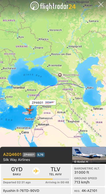 وهبطت طائرة الشحن التابعة لشركة “سيلك واي إيرلاينز” (Silk Way Airlines)، من طراز إليوشن Il-76، وتحمل رقم الرحلة (AZQ4601) في تل أبيب يوم الاثنين بعد مرورها بالمجال الجوي التركي قادمة من باكو.