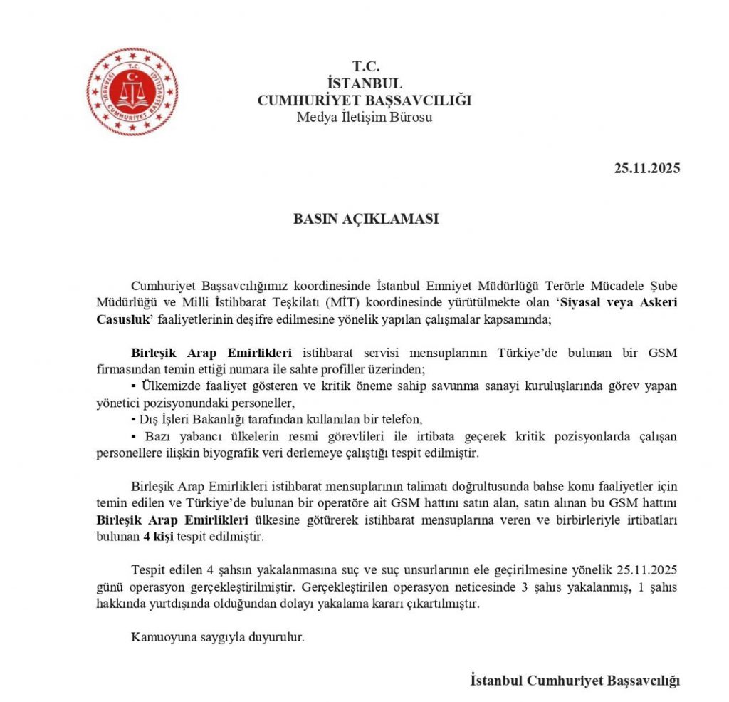أنقرة (زمان التركية)ــ حذفت نيابة إسطنبول بيانا أصدرته اليوم، الثلاثاء، بشأن الكشف عن “شبكة تجسس إماراتية“، ونشرت بيانا آخر يخلو من الإشارة إلى الإمارات.