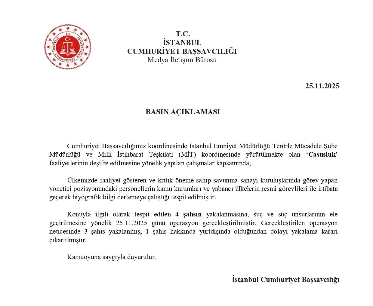 وفي بيانها المحدث، ذكرت نيابة إسطنبول، أنه “تم رصد محاولات لجمع معلومات بشأن مسؤولين يشغلون مناصب حساسة في مؤسسات الصناعات الدفاعية داخل تركيا وأرقام الاتصال الخاصة بمسؤولي بعض الدول الأجنبية”.