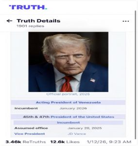 ومؤخرا، أقدم ترامب على نشر صورة تصفه “بالرئيس المؤقت لفنزويلا” خلال تغريدة شاركها عبر حسابه بمنصة تروث سوشيال.