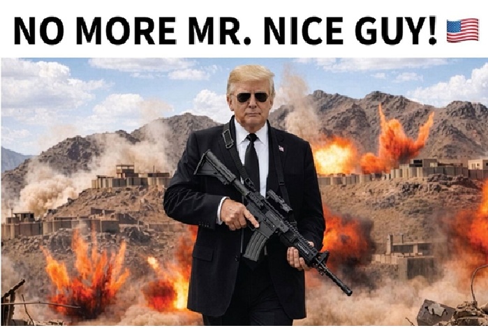 وتضمنت التغريدة صورة مولدة بالذكاء الاصطناعي لترامب وهو يحمل السلاح في أجواء مشابهة للحرب، تضمنت انفجارات، تحمل مع عبارة “لا مزيد من الرجل اللطيف”، وههو عنوان رواية تقول إن الاعتقاد بأن المرء إذا كان لطيفًا، فسوف ينجح في الحياة، هو اعتقاد ساذج.